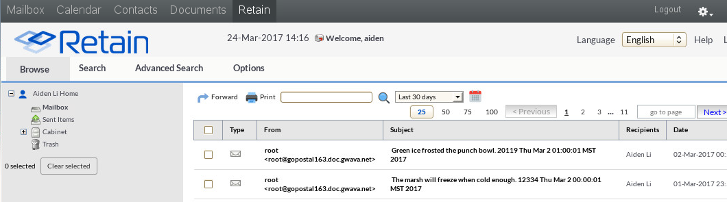 The Retain for GroupWise WebAccess Plugin is a quick and effective way to integrate access to the Retain archive into WebAccess for users. The Plugin adds a button which will automatically take users to their personal archive. The archive interface will be displayed inside the WebAccess window, and provides all the same access and management of the archive which users can experience by directly logging in to Retain.