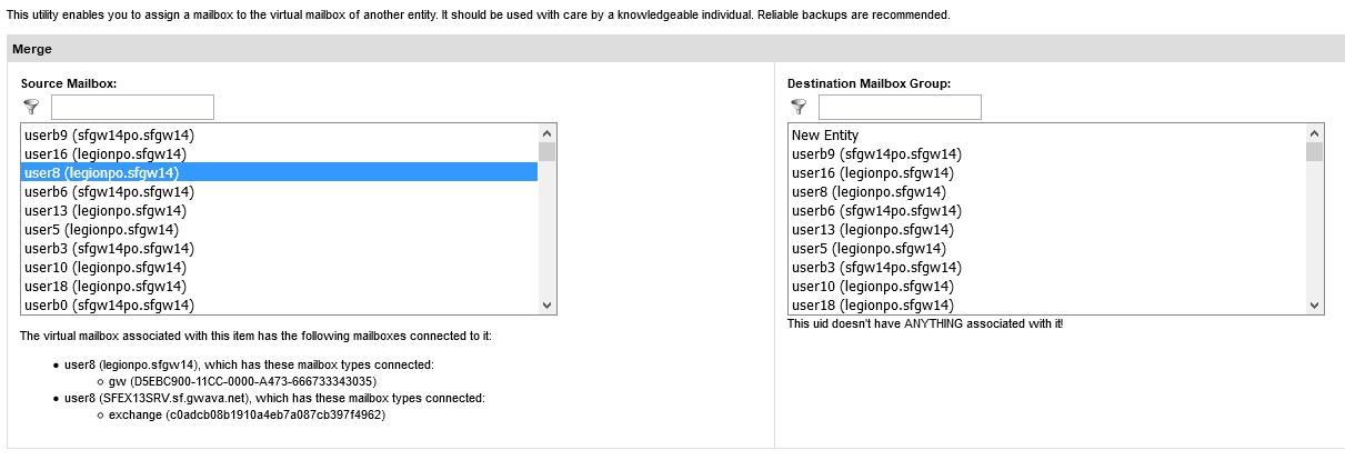 To remove currently merged accounts, select the account you wish to sever as the source mailbox and merge it to a ‘new entity’. Because the merge utility relies on tying entities to accounts in the database, the ‘new entity’ simply unties the account from any other connections. Tying a user to a new entity does not create any new, floating entities or make any changes in the mail systems; it only severs the selected account from previously merged accounts.