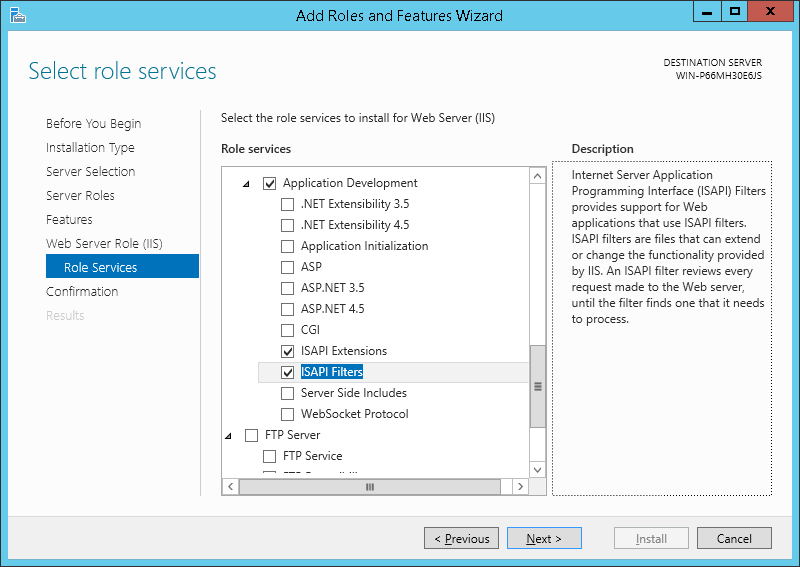 4. On the Server Roles page, expand Web Server (IIS), expand Web Server, expand Application Development, and then select ISAPI Filters and ISAPI Extensions. Click Next.