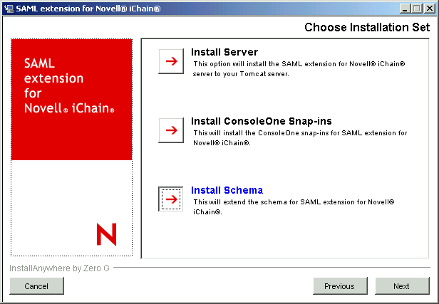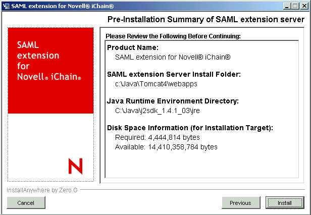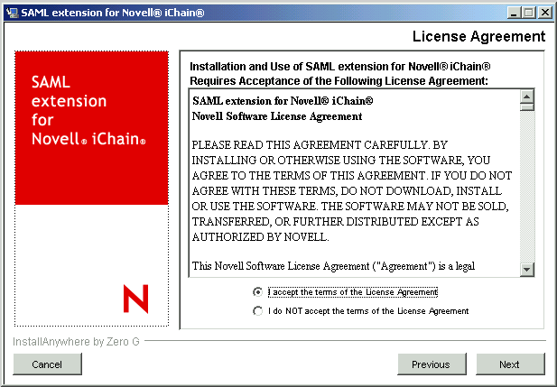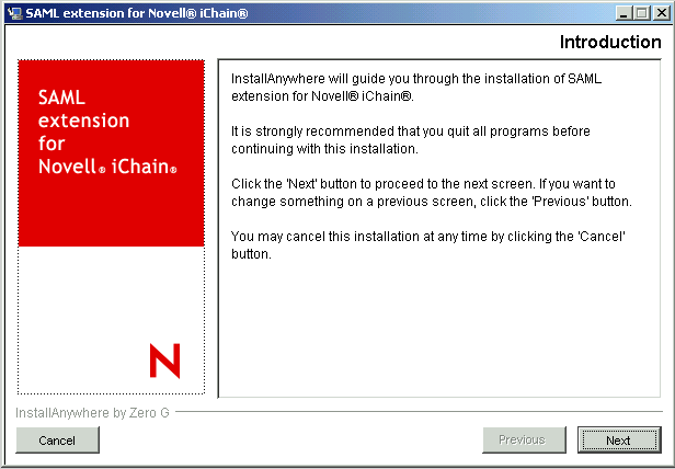 NOTE: The Novell-supported platforms for the SAML extension for Novell iChain software are Windows 2000, Red Hat Linux 8, and NetWare 6 with Support Pack 3. You should run the installation executable on the machine you are designating as the SAML server.