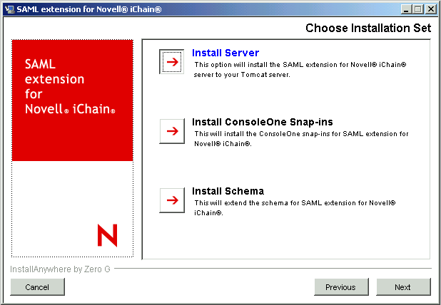 Install Server: This option installs the SAML Extension for Novell iChain Web application. You should run this option on the machine you want to be the SAML extension server. This component requires that the system has Java Development Kit (JDK*) 1.4.1 or later and the Tomcat servlet engine installed.