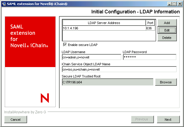 LDAP Server Address: The address of the LDAP servers that contain the configuration and users for the SAML extension server. These should be the same LDAP servers that contain the configuration and users for iChain. You must enter information in this field or the server does not function properly.