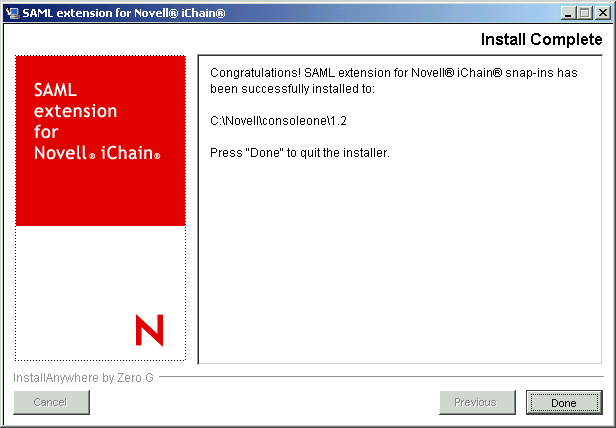 When the ConsoleOne snap-ins installation has successfully completed, an Install Complete screen appears. Click Done to exit the ConsoleOne snap-ins installer