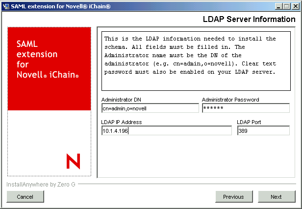 In order to install the schema, you must specify the Administrator DN, Administrator Password, LDAP IP Address, and LDAP Port information for your LDAP server. You must also enable clear text password on your LDAP server.