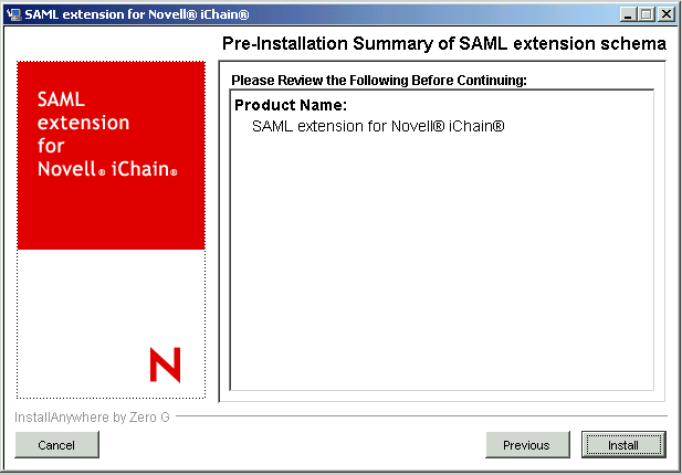 The SAML extension for Novell iChain software should only be installed on compatible hardware. The installation is divided into four sections: an installation introduction, the server installation, ConsoleOne snap-ins installation, and schema installation.