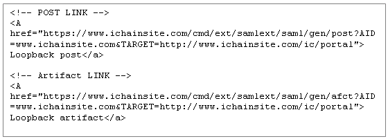 The two links of interest here are Loopback Post and Loopback Artifact. The post link performs a SAML single sign-on operation using the SAML Browser/POST profile. The artifact link performs a SAML single sign-on operation using the SAML Browser/Artifact profile. Figure 26 shows the HTML source of the two links: