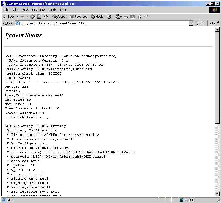 There are a number of ways to start the Tomcat Servlet container. The most common way is to run tomcat_home/bin/Catalina.bat with the run command. On Windows* operating systems, the Tomcat installer creates a program group on the Windows Start menu. After Tomcat has been started, you can determine if the SAML extension server is deployed by entering the following URL: http://www.ichainsite.com/cmd/ext/samlext/status. This URL displays information about the running SAML extension server components. If the system is running properly, a page like Figure 24 is displayed: