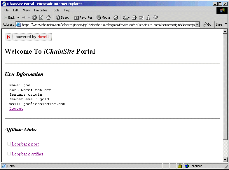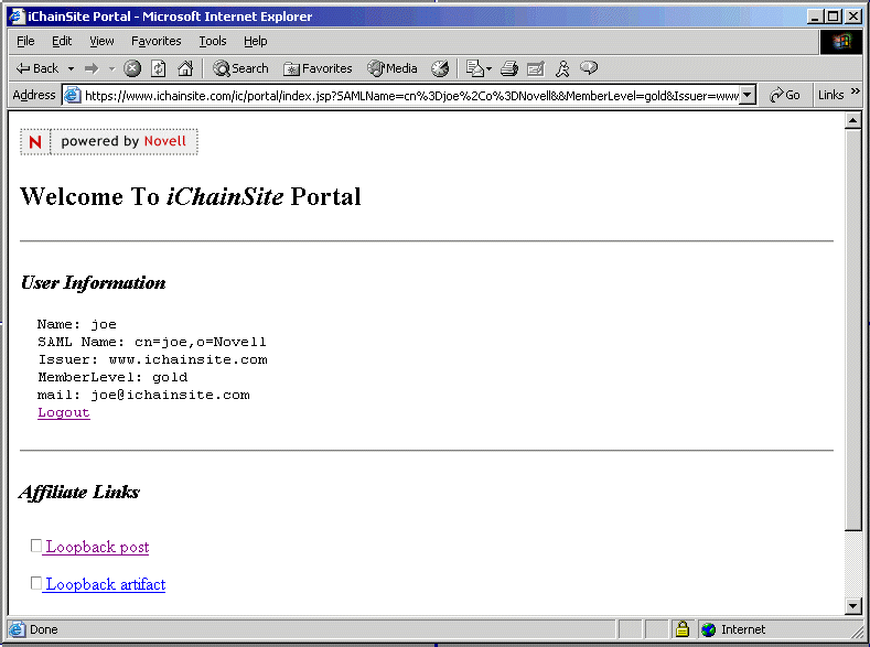 After the SAML extension server has been configured and deployed, you can begin testing it. Access the main iChain Site sample application by entering the following URL: http://www.ichainsite.com/ic/portal. You should be prompted to authenticate to iChain. After successful login, you should receive a page like the one shown in Figure 25: