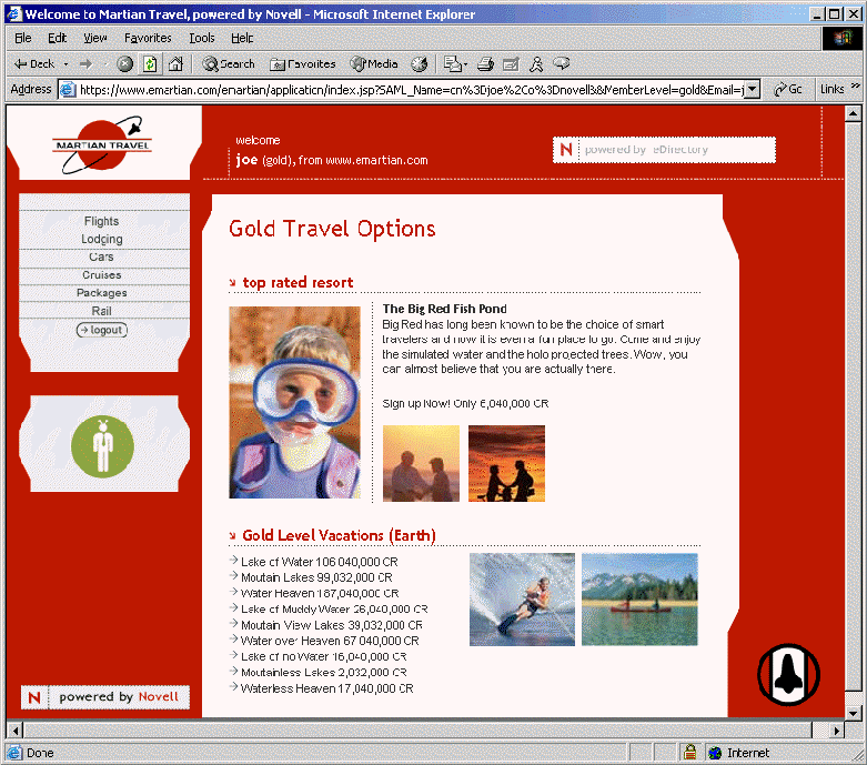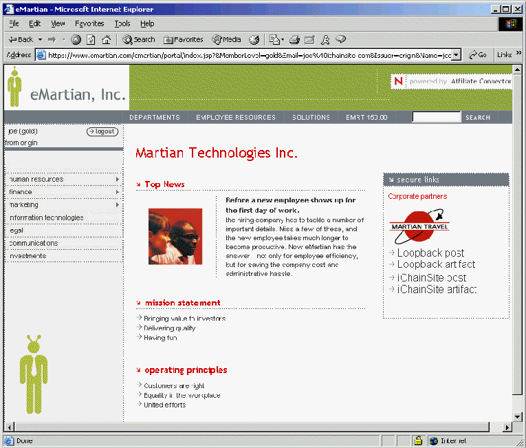 One important difference between the eMartian site and the iChainSite sample is that the eMartian Target parameter is set to the eMartian application, rather than to the portal. When you click the loopback links, you go to the eMartian application instead of the portal where you started. After you click the loopback link, a page is displayed as shown in Figure 45: