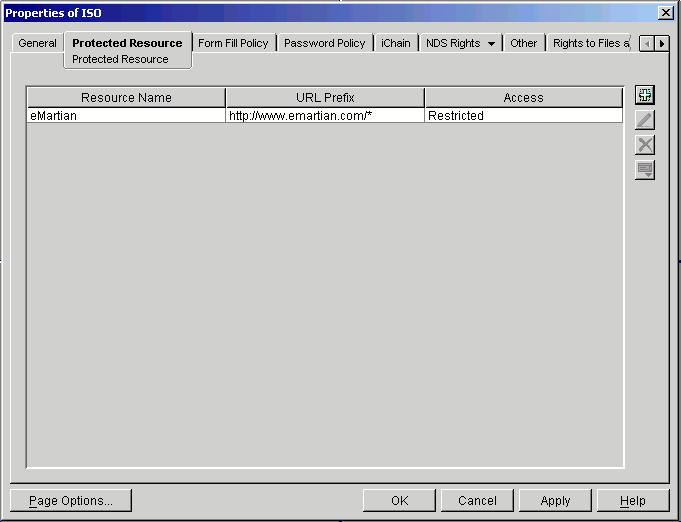 Using ConsoleOne®, you must define both a protected resource for the eMartian application, as well as the OLAC parameters to pass to the application. To do these operations: