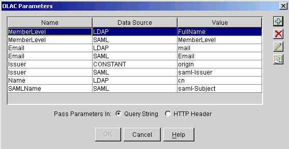 It is important that the parameter names (Name) match those in Figure 31. The eMartian demo application relies on these name values, and if they are different, the application does not work. The LDAP value names (Value) do not need to match as long has you have the appropriate LDAP attribute set on the test user objects. You can use different LDAP values than fullName for MemberLevel and mail for Email.