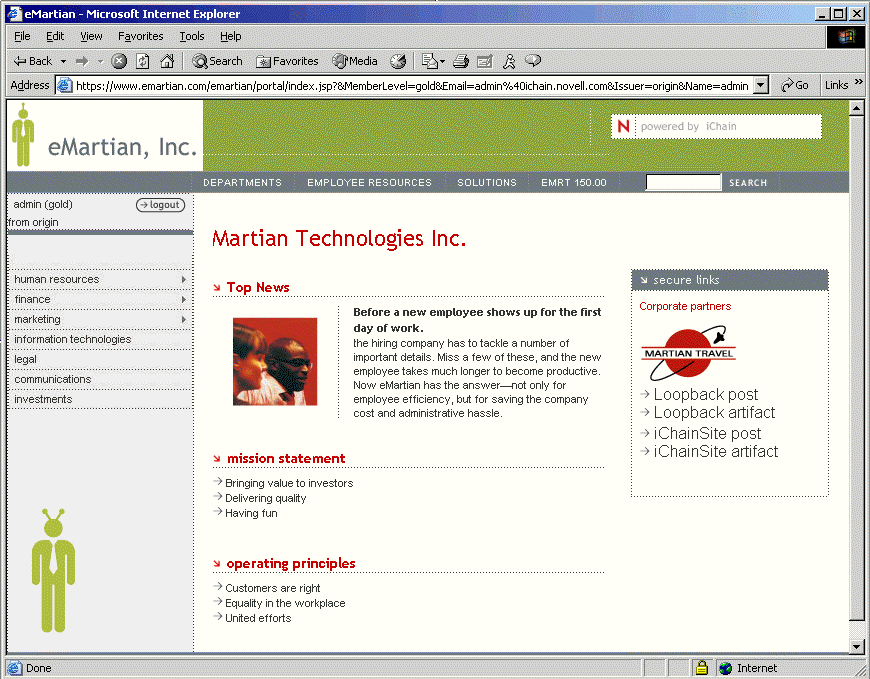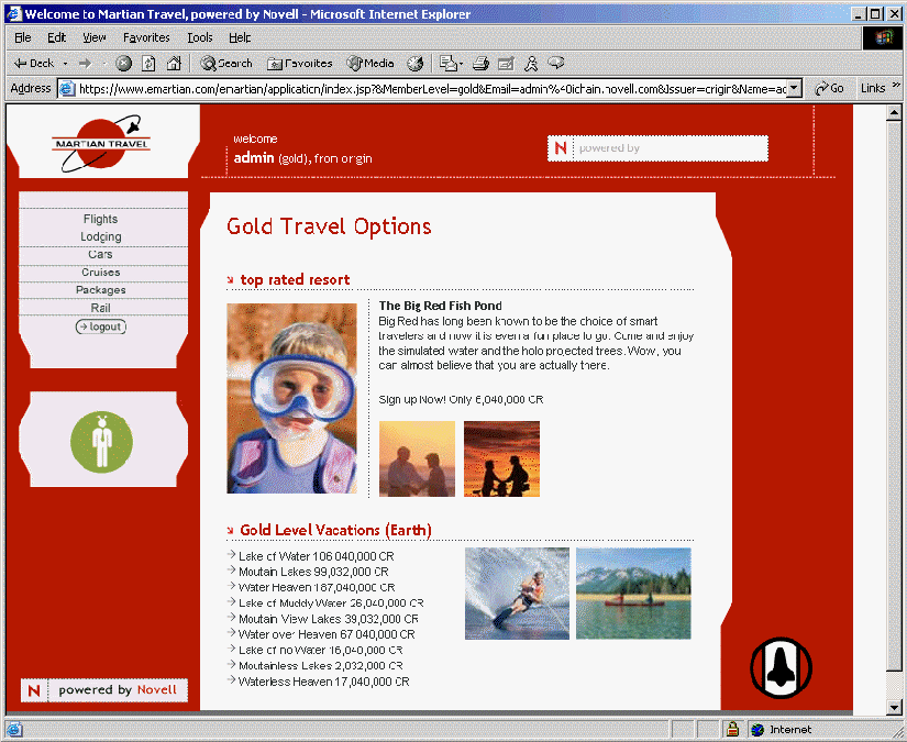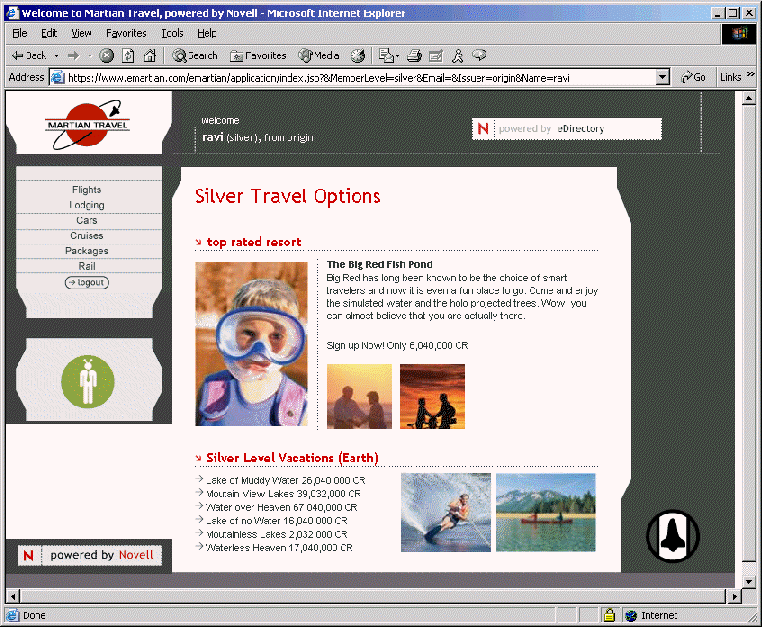 You should verify that the LDAP properties are being passed correctly. In the example shown in Figure 32, the user is logged in as Admin and has a fullName (MemberLevel) of gold. By selecting the Martian Travel link on the right-hand side of the page, you access the eMartian application. A page should display as shown in Figure 33:
