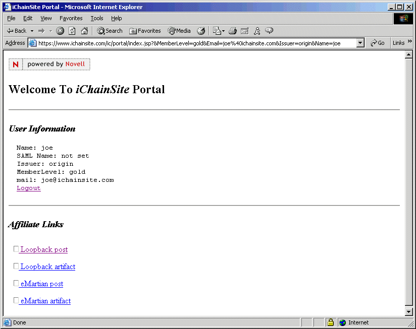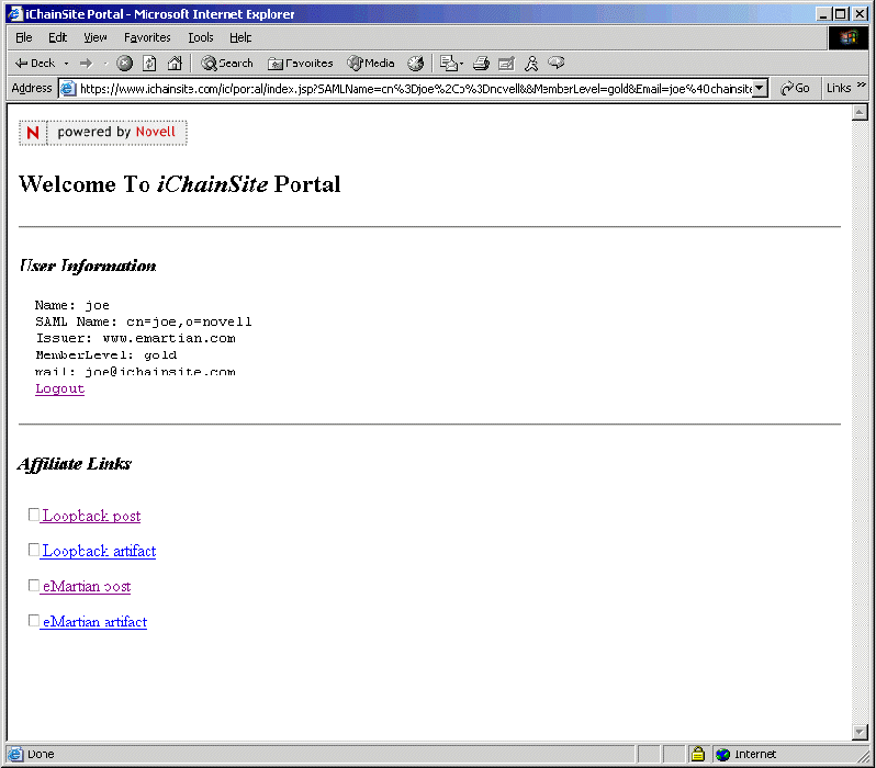 Clicking on either of the eMartian links causes the iChainSite to generate a SAML assertion intended for eMartian. The user will then be sent to the appropriate SAML receiver URL on the eMartian site. The SAML service running at eMartian will validate the provided SAML assertion, evaluate the user mapping rules, and provide the user with the target resource.