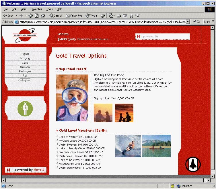 Clicking either of the iChainSite links causes the eMartian system to generate a SAML Assertion for iChainSite, sending the user to the SAML receiver at the iChainSite. The SAML service running on the iChainSite processes the provided assertion, maps the user to an identity, and provides the user with the requested resource.
