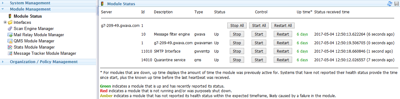 Red indicates a module that is not running and/or was purposely shut down.