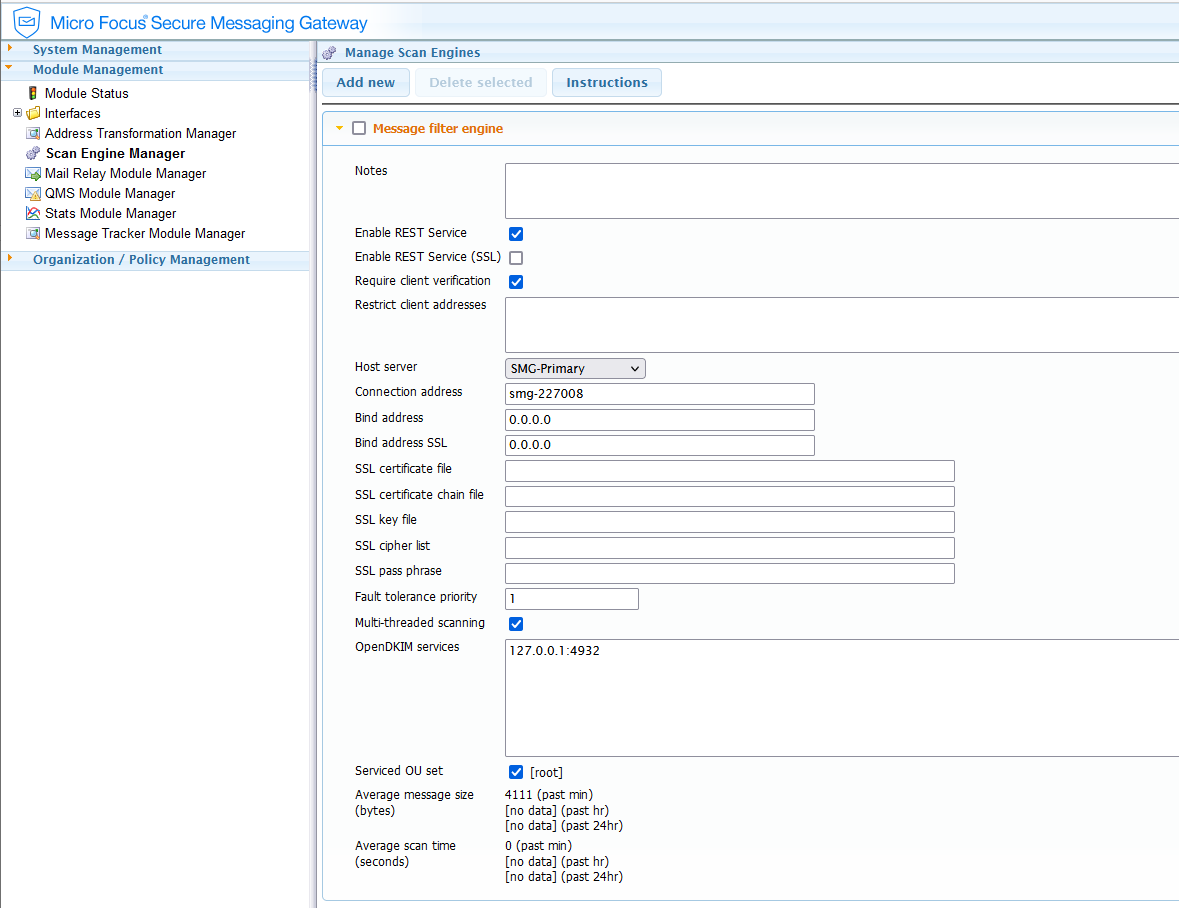 The Scan Engine manager contains the connection address, host server, and OU settings for a scanner.