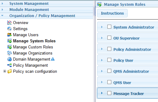 Importantly for systems that utilize the multi-tenant functionality of OpenText Secure Messaging Gateway, system roles must be inherited from the root level of the system. If a role is not made available to a child OU, none of the deeper OU's can access the role. See custom roles for this functionality. The main system user interface interacts with these roles to determine which menu items users may access.