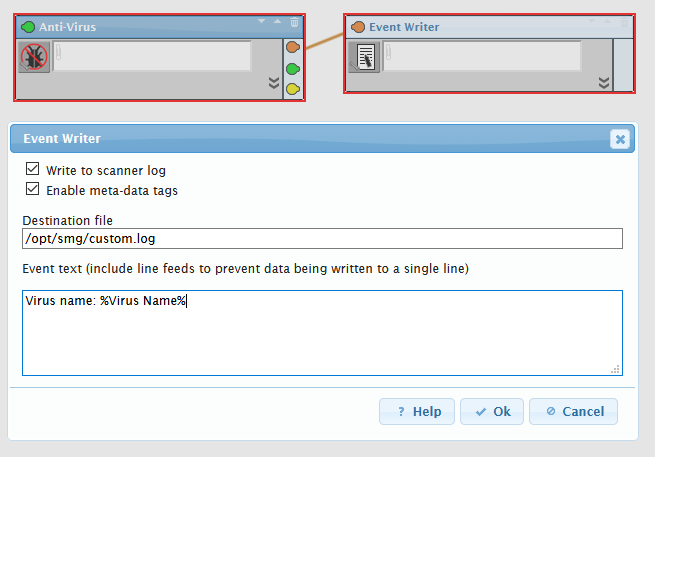 The Event Writer creates a file associated with each time a connected filter or service is activated. The Event Writer is a simple way to create a custom log of whenever an event occurs. When attached to any event, the writer will create the specified file with the specified text. This is in addition to any notifications. If a desired event is to be recorded, or a file is to be created whenever an event occurs, the Event Writer should be used in association with that event. Tie the event writer to the desired event in the workbench and specify the destination file name and contents. While the file name may be anything desired, the contents will be created as shown in the Event Text window. You can also write the event to the scanner log and enable meta-data tags in the event text.