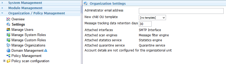 New child OU template: Select a template for new child organizational units. Templates are defined under System Management | Templates.