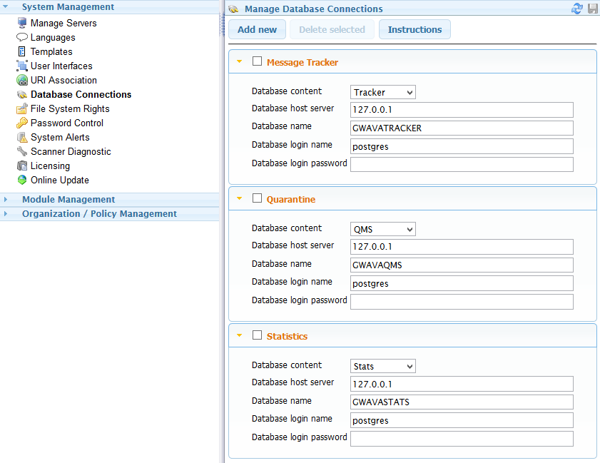The Database Connections manager allows for the configuration of, management of, or removal of QMS and Stats databases for the system. This is designed for use with multiple organization to allow for separate databases for clients or organizations. If multiple organizations do not exist on the system, this feature will not be useful and should be left alone.