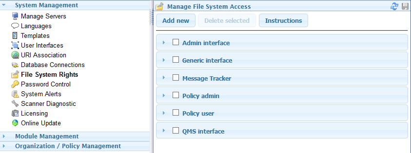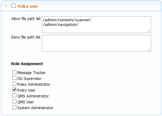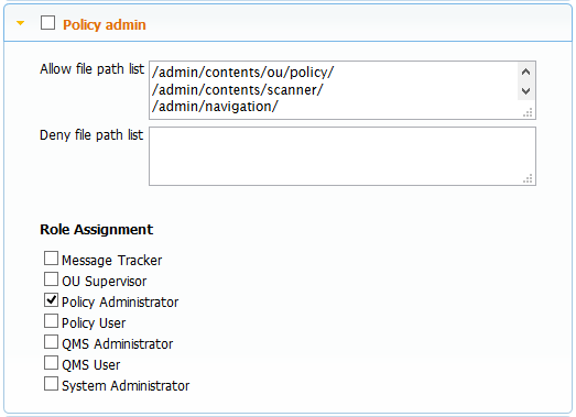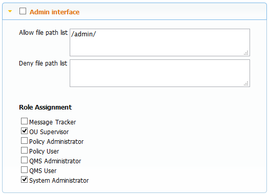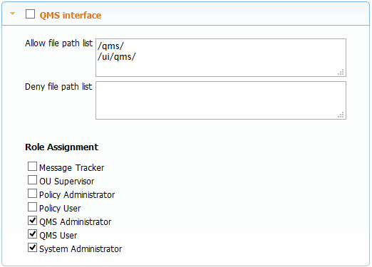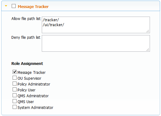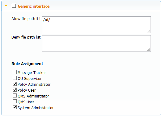 The Allow and Deny file path lists have the locations of the web pages in the interface. Allowing or Denying pages based on their path in the OpenText Secure Messaging Gateway file system allows administrators to fine-tune the interfaces that users have access to. If a page is to be modified, it is highly recommended to copy the page and modify the copy instead of potentially breaking a current interface file.