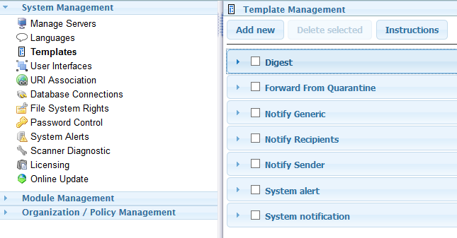 The Template Management provides access to the template pages for all the notifications, digests, and alerts that GWAVA may send.