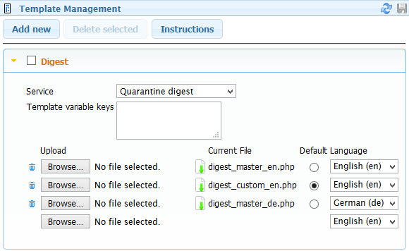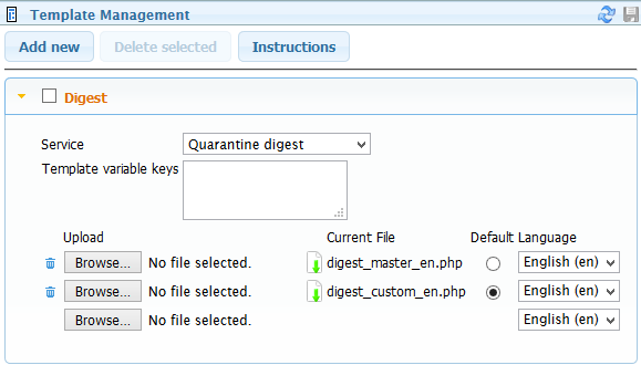 Current File: Lists the current template being used by the service. The file can be downloaded by clicking on the download file icon.