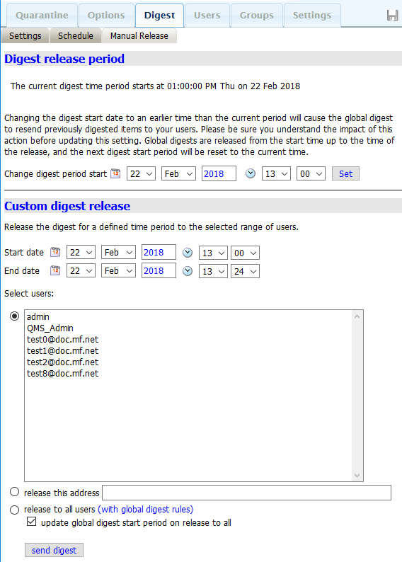 Changing the digest start date to an earlier time than the current period will cause the global digest to resend previously digested items to your users. Please be sure you understand the impact of this action before updating this setting. Global digests are released from the start time up to the time of the release, and the next digest start period will be reset to the current time.