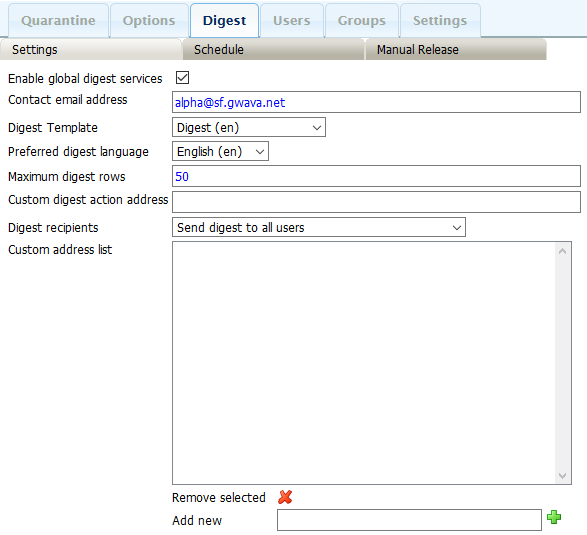 Under the Schedule sub tab select a day or time for the digests to be sent to users with quarantined messages. Generally, this will be set to once or twice a weekday.