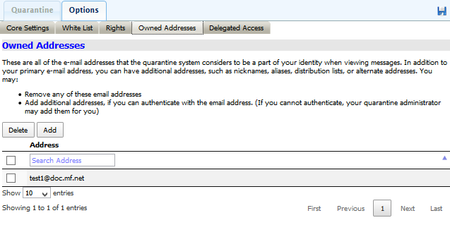 Add a delegate user by clicking Add and providing the email address. This grants the right to view the quarantine.