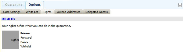 The Options tab provides access to settings information. You may use this to customize your quarantine.