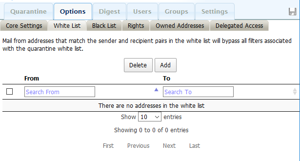 White List: Adds the sender's email address to your white list so they will not be quarantined. This can be managed under the Options tab.