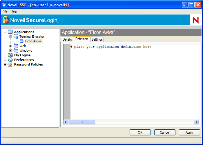 In the following procedure, we are building a terminal emulator application definition on the local workstation for the example application, Eicon Aviva. For more information about application definitions, see Novell SecureLogin 6.0 SP1 Application Definition Guide.