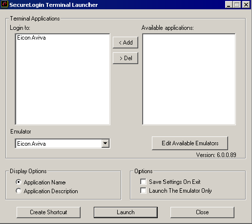 In the Terminal Launcher dialog box, ensure Eicon Aviva is selected in the Emulator drop-down list.