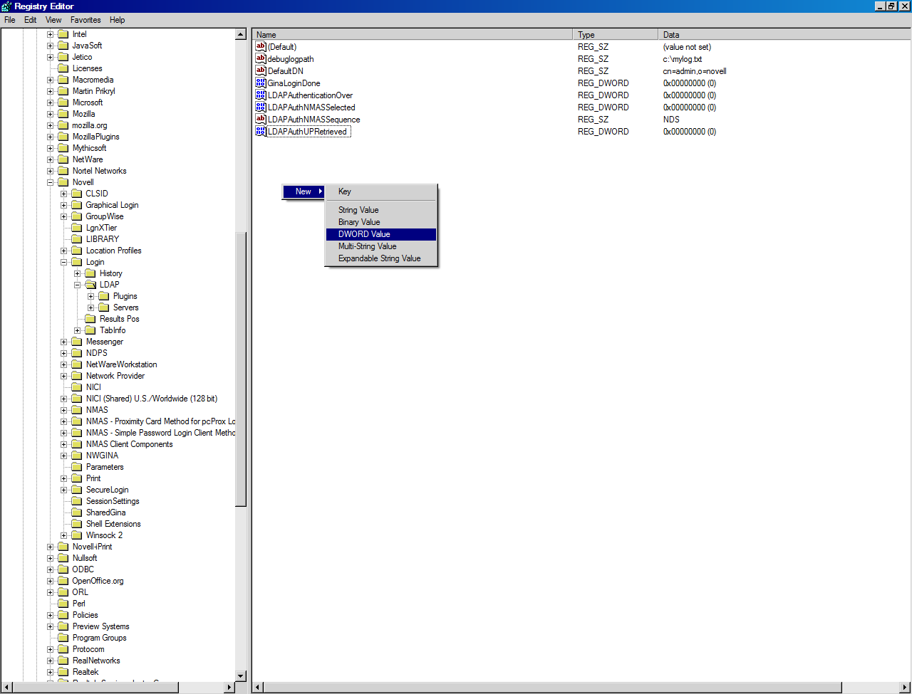 Browse to the HKEY_LOCAL_MACHINE\SOFTWARE\Novell\Login\LDAP directory.