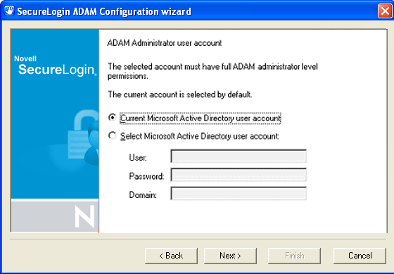 The account selected in this dialog box is used to manage SecureLogin in this ADAM instance and therefore requires Administrator level access. By default the current account (the one you have logged on with) is selected. However, any user account that has Administrator level access to the ADAM instance is valid.