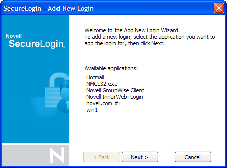 The Add New Login Wizard helps you create multiple logons for the same application or server. The Wizard contains a list of available applications from which you can choose the required logon. For more information, see Section 4.0, Enabling Applications and Web Sites for SSO.