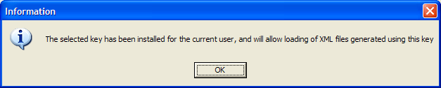 The dialog box provides a tool to install a digital signing key locally, enabling loading of XML files generated using this key