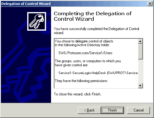 You are now finished with the delegate control wizard for the Service1-SecureLogin-Admins group. Click .