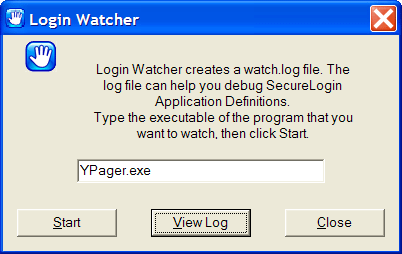 Specify the executable filename in the Login Watcher field. For example, YPager.exe.
