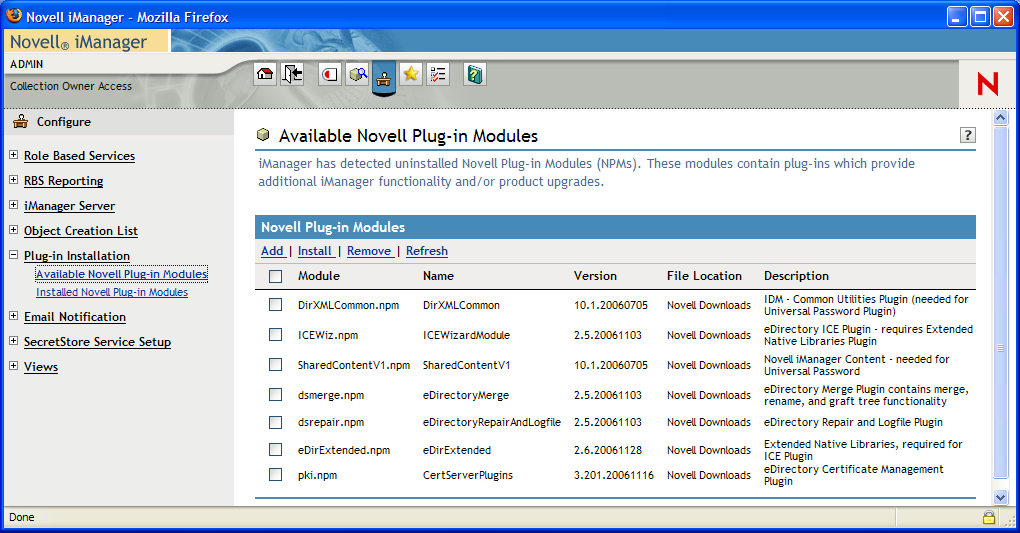 The iManager plug-in are .npm files. The plug-in are: