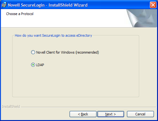 The LDAP option installs Novell SecureLogin into LDAP v3 directory environments (for example, Novell eDirectory 8.5 or later).