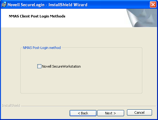 The Novell NMAS Client option installs the NMAS client. SecureLogin uses this option with the AAVerify command, to enable advanced authentication access to an application and also for NMAS authentication using LDAP.