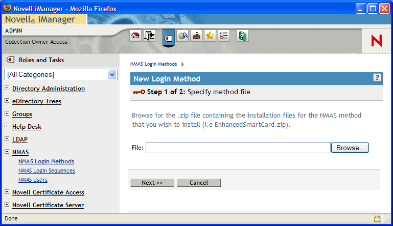 Browse and locate the .zip file containing the installation files for NMAS method that you want to install. This is found in \Nmas\NmasMethods\Novell\SecureWorkstation\SecureWorkstation.zip that is available as part of the Novell SecureLogin installation at the Novell Download Web site.