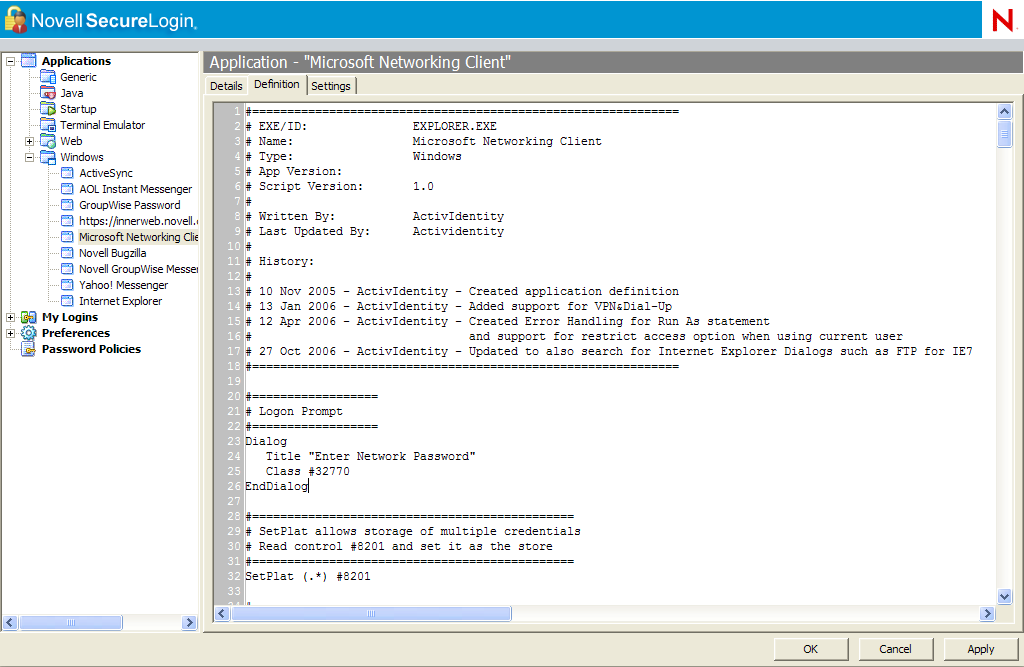The tab contains the application definition. An application definition directs how Novell SecureLogin responds to various screens (dialog boxes) returned by the application. The details displayed are either the application definition created by the Novell SecureLogin when the predefined application or the application definition was added, or when the application definition was manually created by the user.