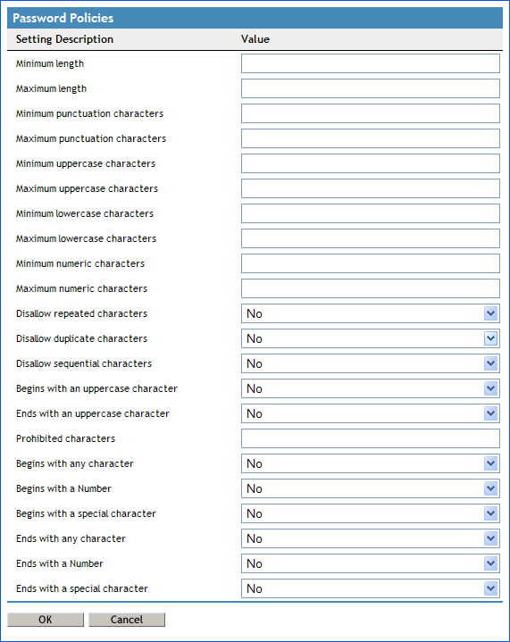 If this option is set to , it automatically disables all other policies that specify what the first character of the password should be. |