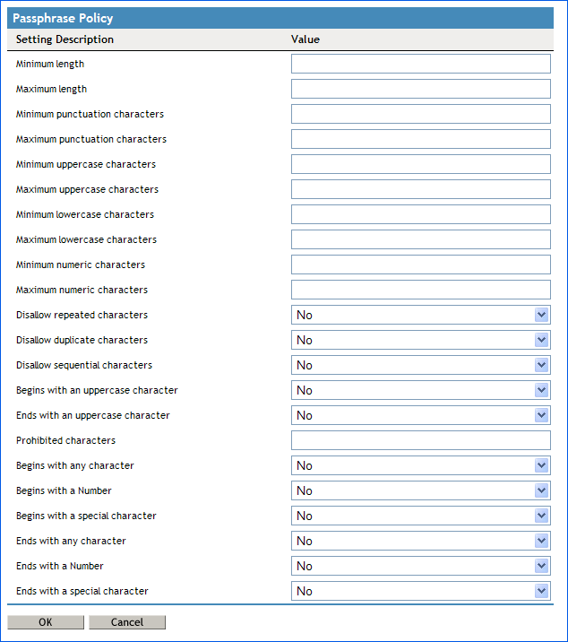 If this option is set to , all other policies that indicate that a passphrase must begin with a particular character or in a specific manner are disabled.