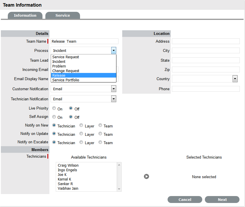 The Team Lead options are drawn from the Assigned Technicians who are assigned the Release Process.