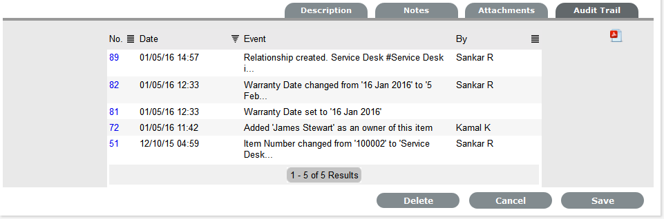 The Audit Trail tab records all changes that are made to fields within the Item Information and Details screens. These entries are made to record all the alterations made to Items and the CMDB.