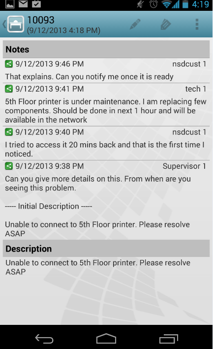 Notes: Displays notes recorded for the tasks along with the date and time stamp.